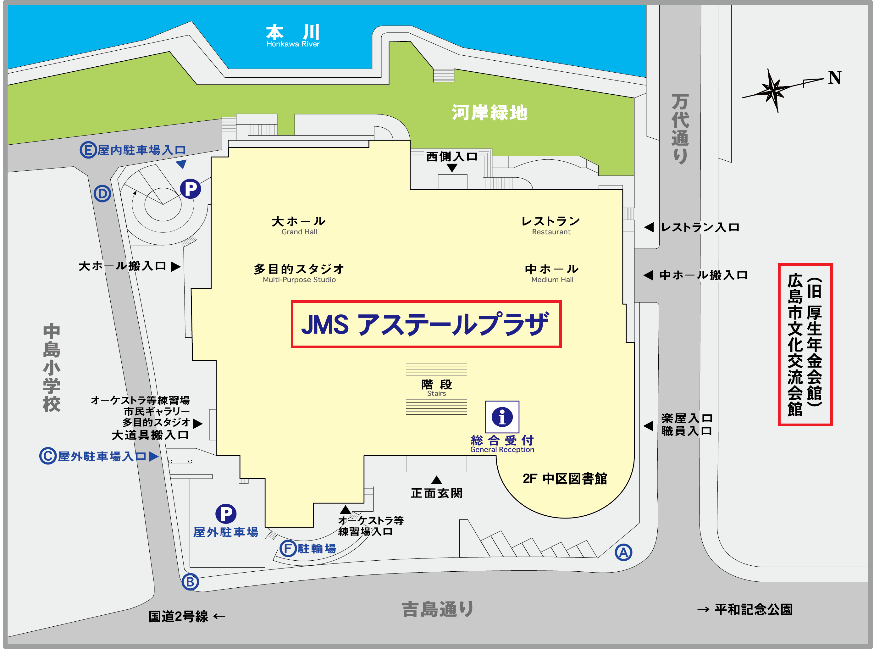 | 市内電車利用の場合 | 広島港行(紙屋町経由)-市役所前下車(600m)